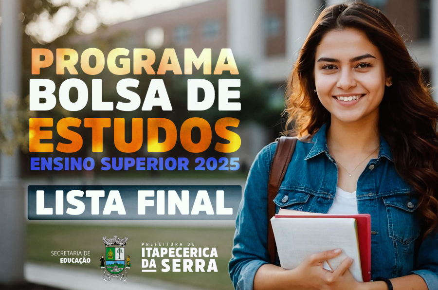 A Prefeitura de Itapecerica da Serra, por meio da Secretaria de Educação, divulga a lista final dos candidatos contemplados com a Bolsa de Estudos para o Ensino Superior, conforme a Lei Municipal nº 589, de 04 de maio de 1990, e o Edital nº 009/2025-SAJ-Ato, de 14 de janeiro de 2025.