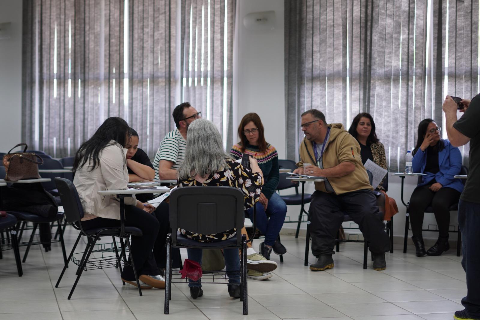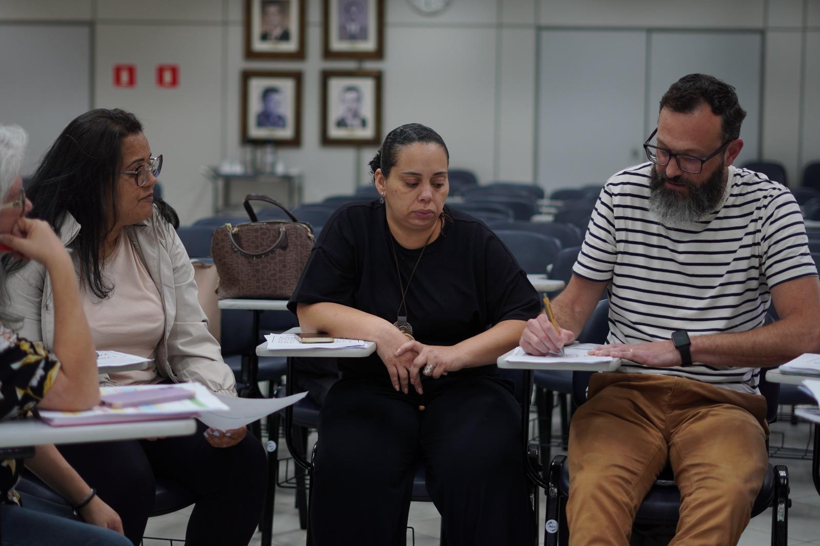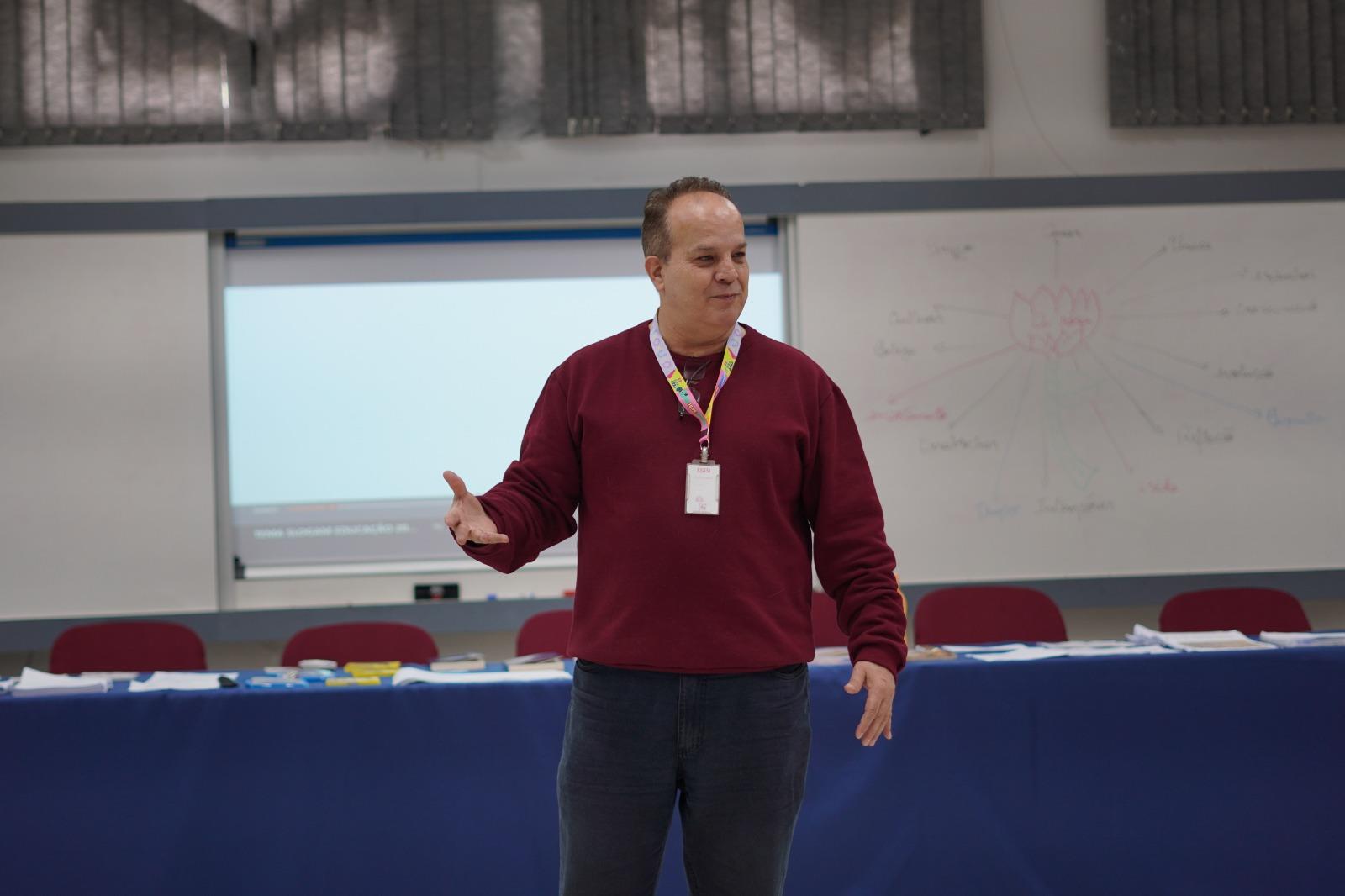 Os participantes foram divididos em grupos para momentos de análises e de situações cotidianas no ambiente escolar, e Fernando conduziu a formação com assuntos que resumiram os encontros anteriores.