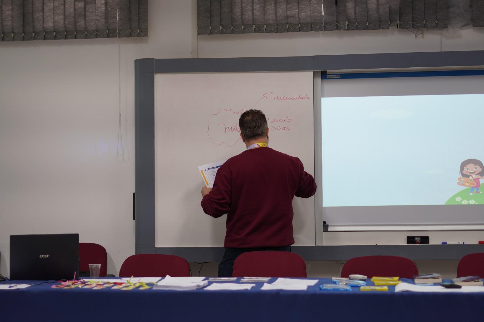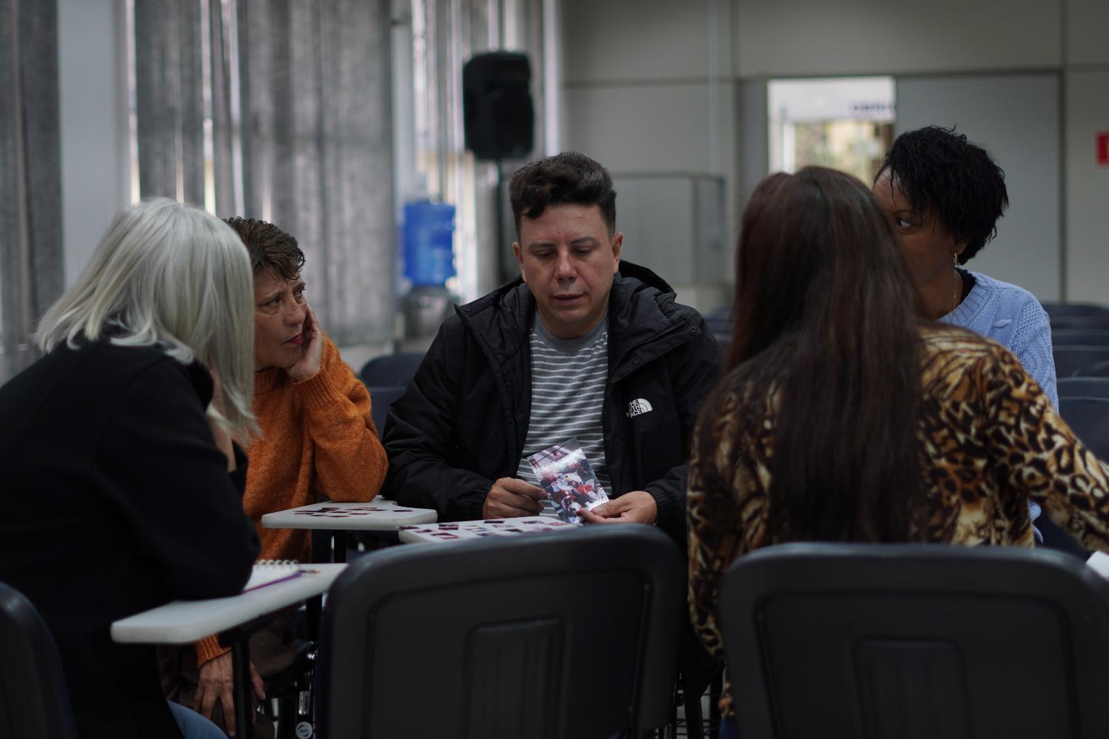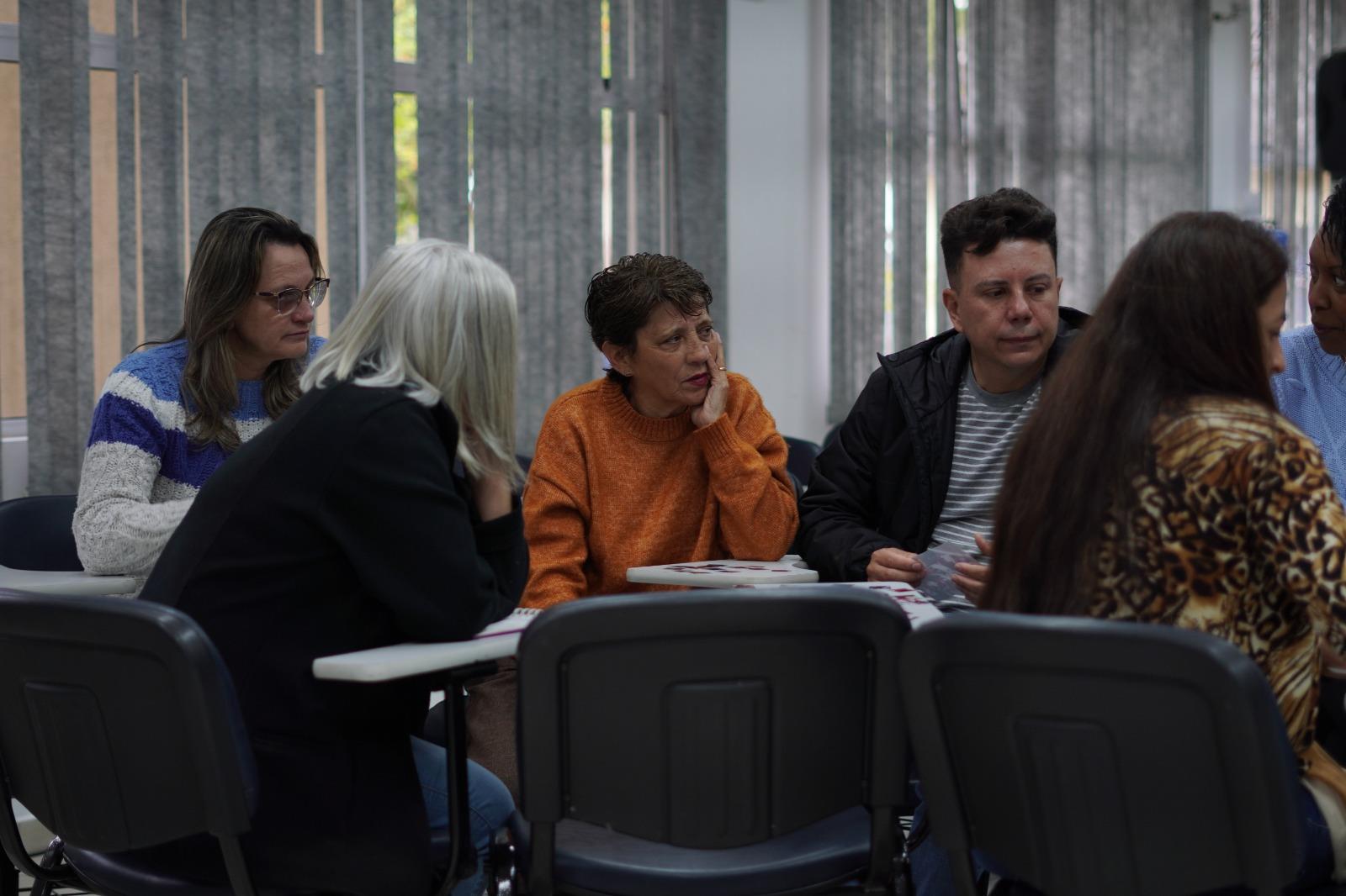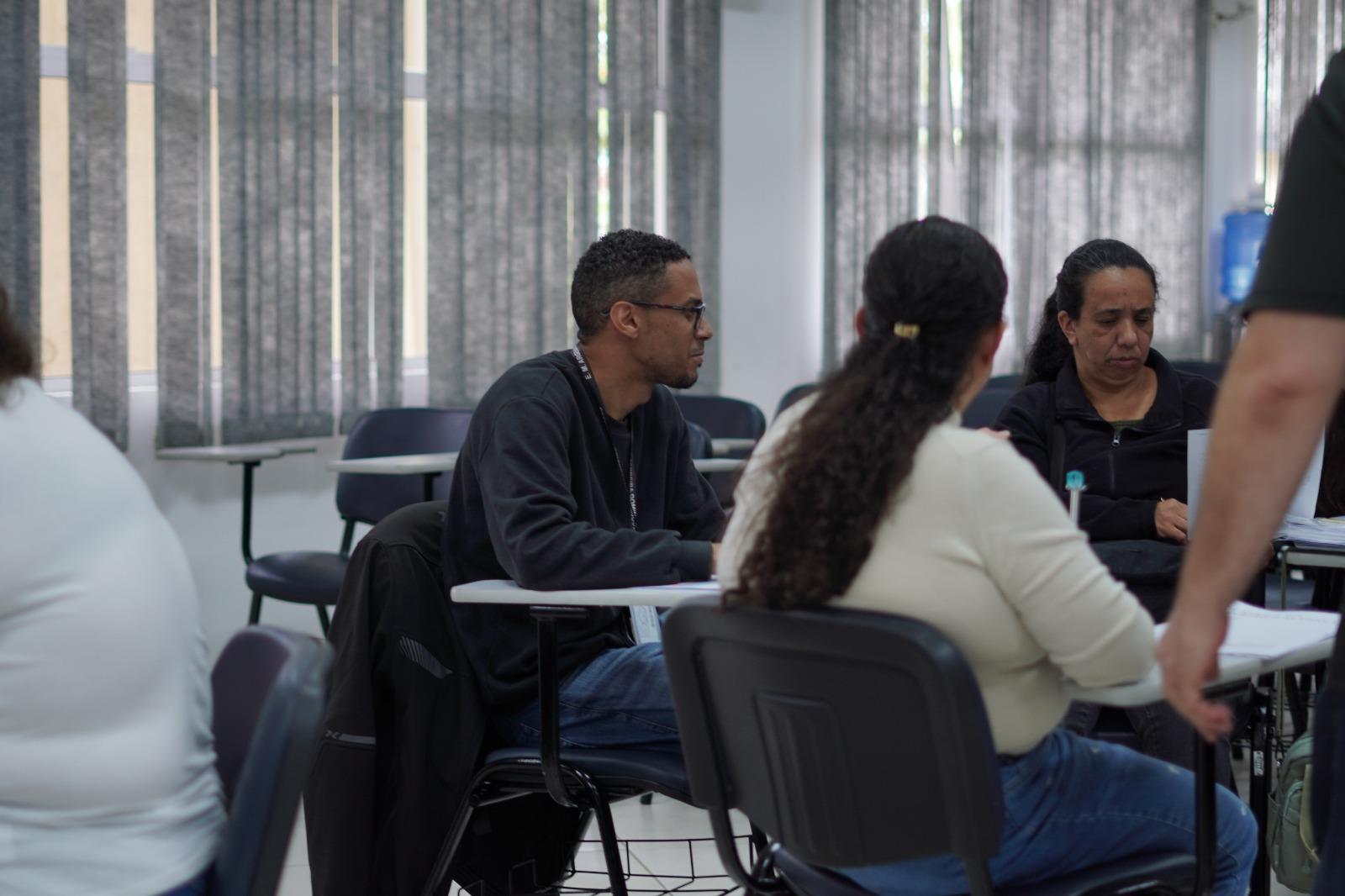 Os participantes foram divididos em grupos para momentos de análises e de situações cotidianas no ambiente escolar, e Fernando conduziu a formação com assuntos que resumiram os encontros anteriores.